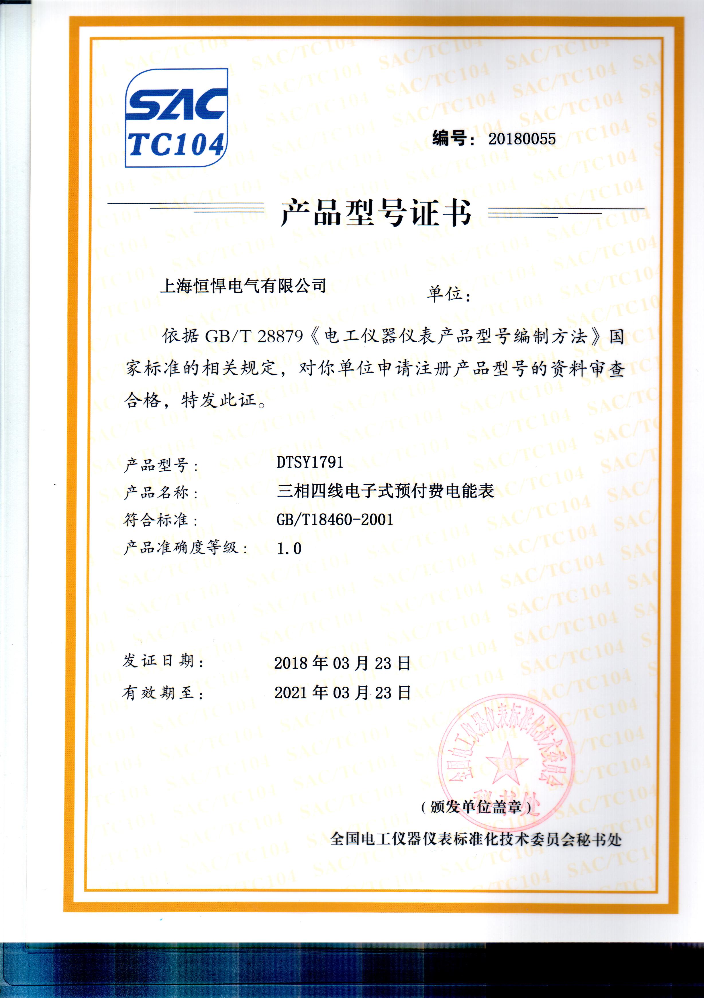 • 恒悍三相預(yù)付費(fèi)電表型號證...